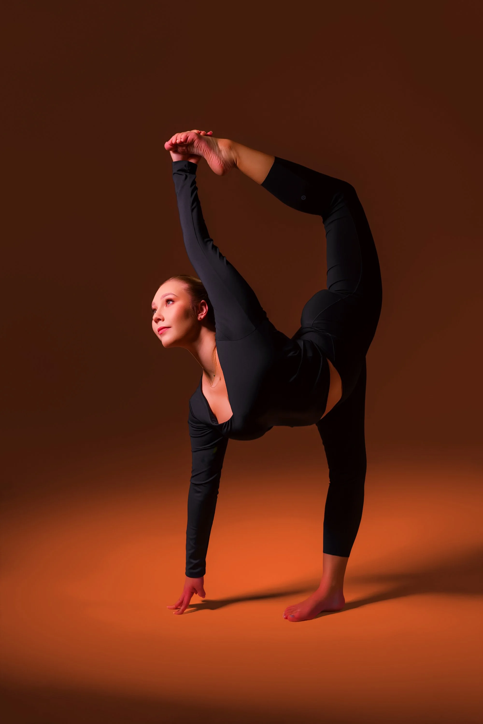 Young woman practicing gymnastics, performing a one-handed balance in a super flexible pose, flexible in a balanced act.